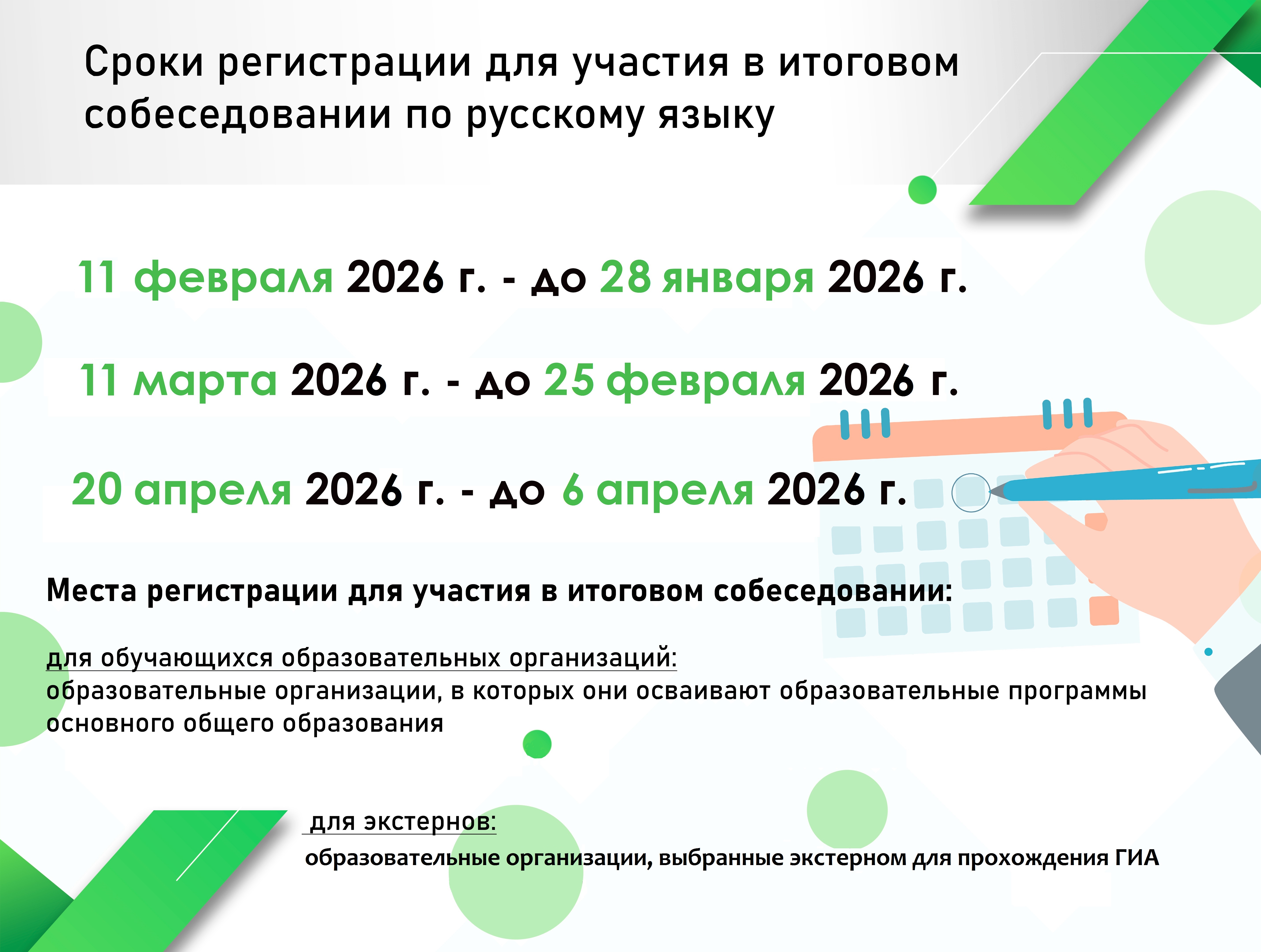 Заявления подаются в образовательные организации не позднее чем за две недели до начала проведения итогового собеседования по русскому языку лично или через информационную систему образовательных услуг «Виртуальная школа».